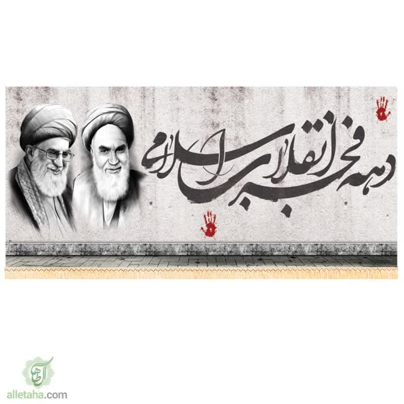 On the left side of the flag, you can see the photo of the Imam and the leader, and on the right side, you can see the text of the Fajr Decade of the Islamic Revolution.