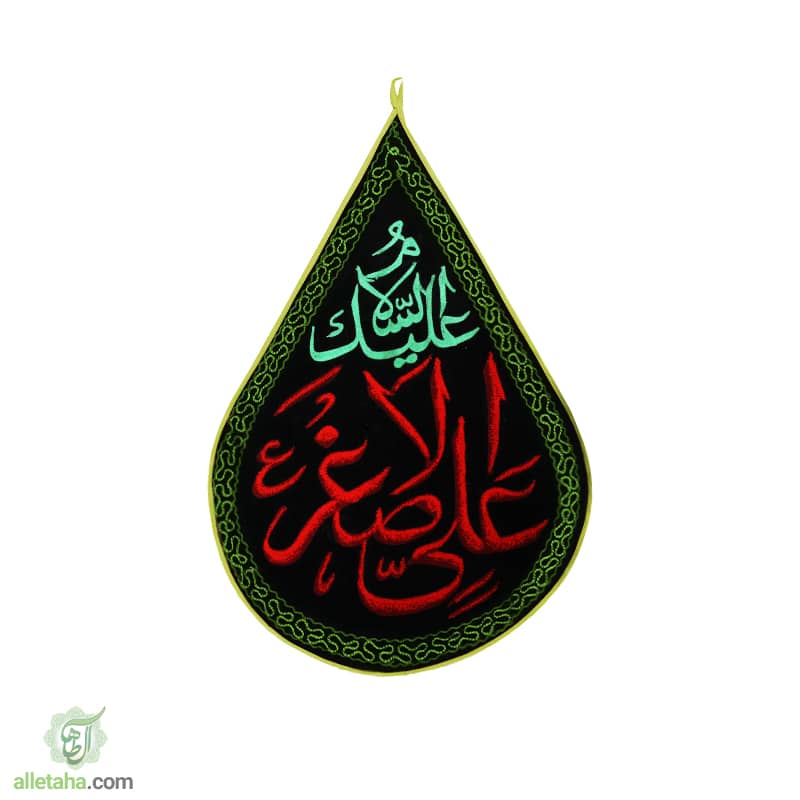 This beautiful teardrop flag is made in black color, which is one of the most used colors in mourning ceremonies, and it is embroidered all around, and the blessed name of Hazrat Ali Asghar, the infant who was martyred in the Karbala incident, is in the middle of the flag. It is the most beautiful form of embroidery.