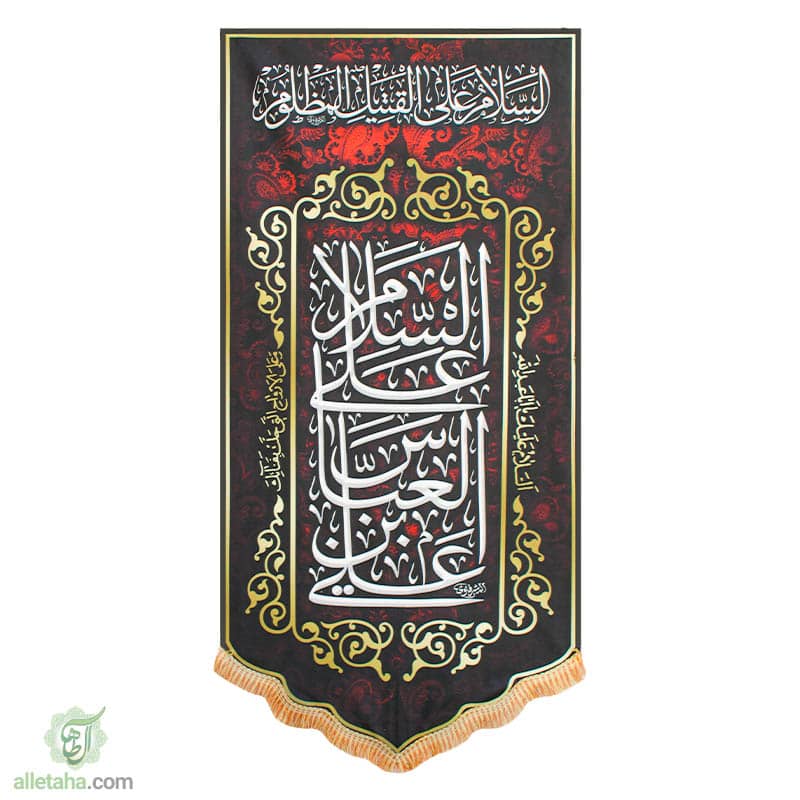 اطراف این پرچم آویز طرح های گلدار زیبایی دیده می شود و حاشیه ای طلایی رنگ که در میان آن نام مبارک حضرت ابالفضل العباس علیه السلام قابل رویت است.