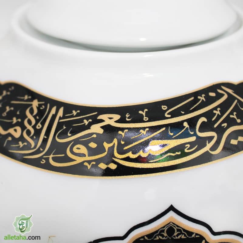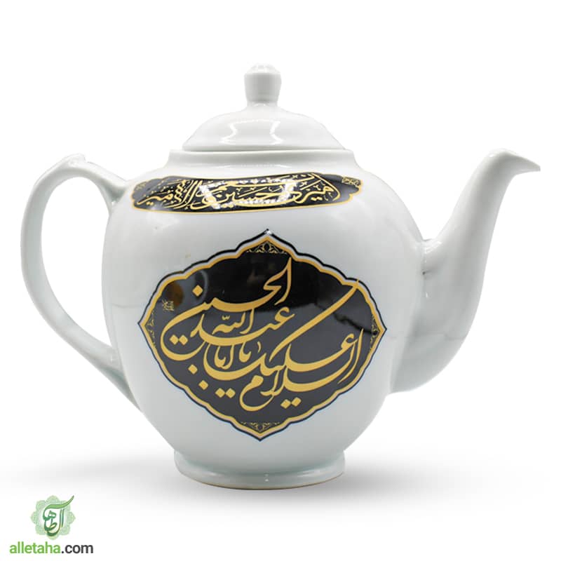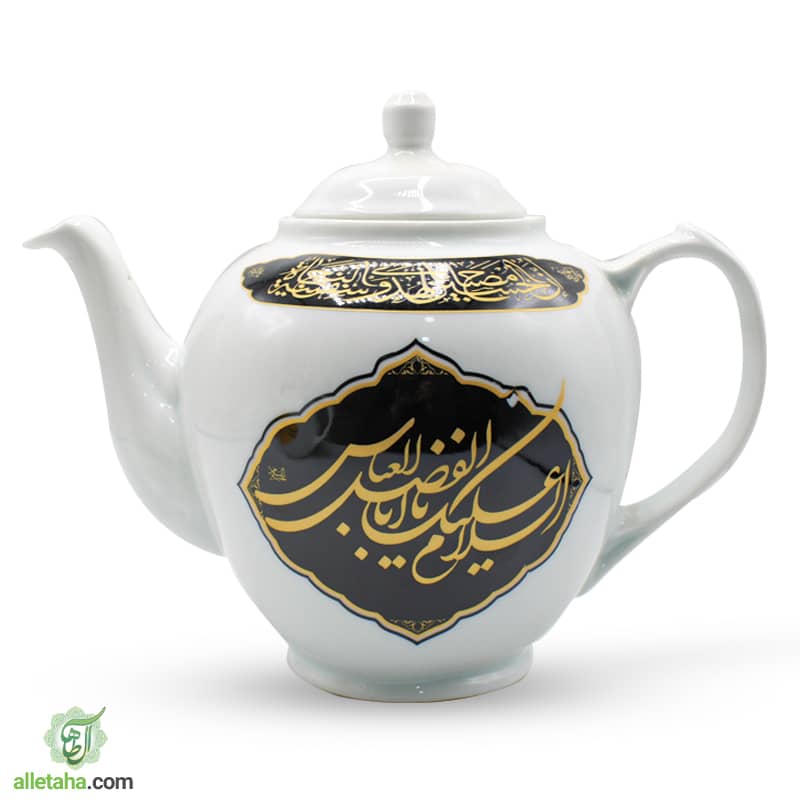 قوری دو ونیم لیتری به رنگ سفید چاپ مشکی به نام سالار شهیدان ابا عبدلله الحسین و علمدار دشت کربلا ابالفضل العباس می باشد.