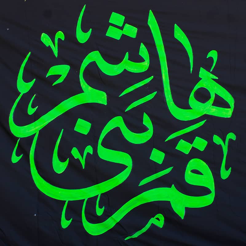 در حاشیه های کنار پرچم، عبارت “یاقمر بنی هاشم” به رنگ سبز دیده می شود.