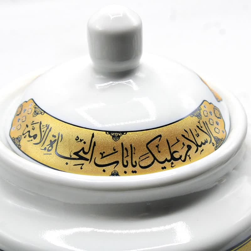 عبارت ” السلام علیک یا اباعبدالله الحسین، یابن فاطمه الزهرا ” در یک طرف قوری چاپ شده است که زمینه ی طلایی پر رنگ با نوشته مشکی دارد.