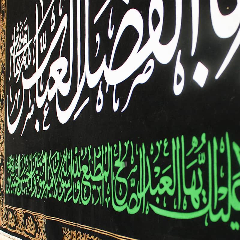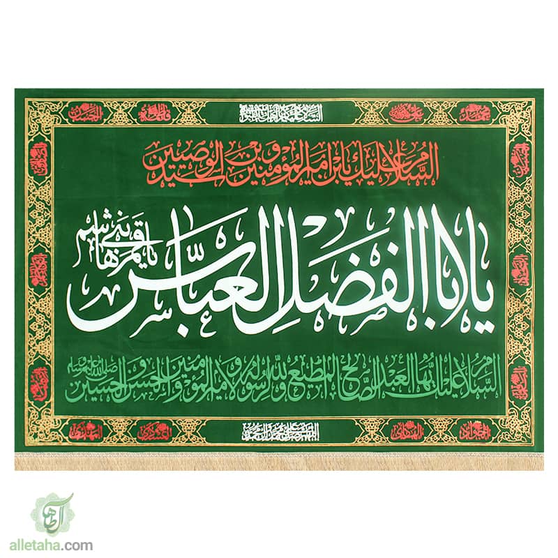 پرچمی که در پیش چشمانتان مشاهده می کنید از پرچم های مناسبتی و محرمی است که جنس آن مخمل و نوع چاپ آن طلاکوب بوده که نام زیبای ابالفضل العباس در وسط این پرچم خود نمایی می کند.