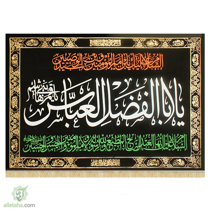 در حاشیه بالا و پایین نام زیبای علمدار دشت کربلا فراز هایی از زیارت حضرت ابالفضل العباس چاپ شده است.