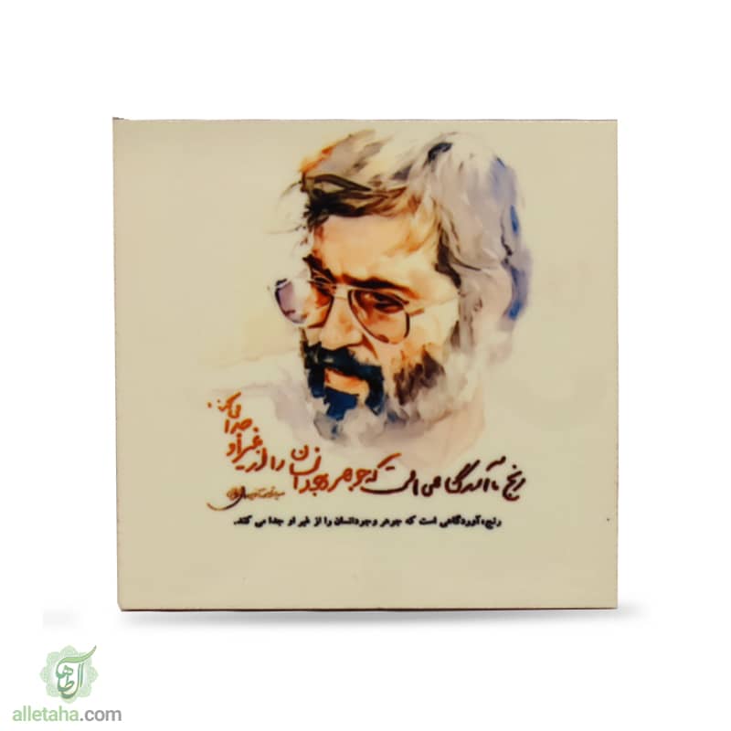 روی این کاشی عکس شهید آوینی با کیفیت بسیار بالا چاپ شده است و در زیر عکس این شهید جمله زیبایی نیز چاپ شده است.