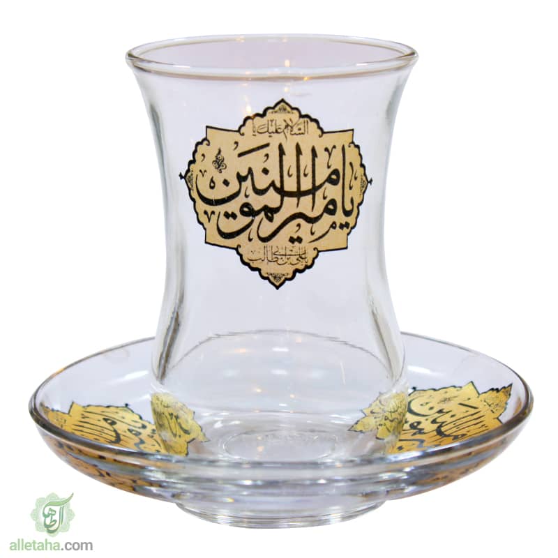Al Taha store in Mashhad offers all kinds of religious catering supplies, including these glasses. The product we are introducing here is a set of glasses and saucers with the name of Amir al-Momenin.