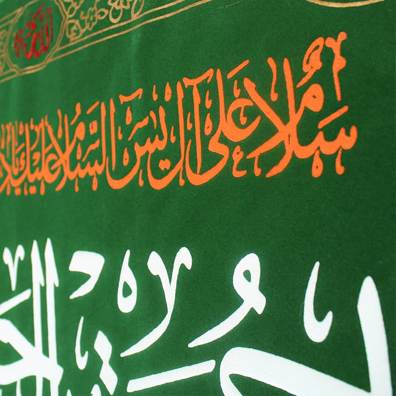 In the golden border around the flag, you can see the names of 5 people of Al-Abba, which doubles the spiritual value of the flag.