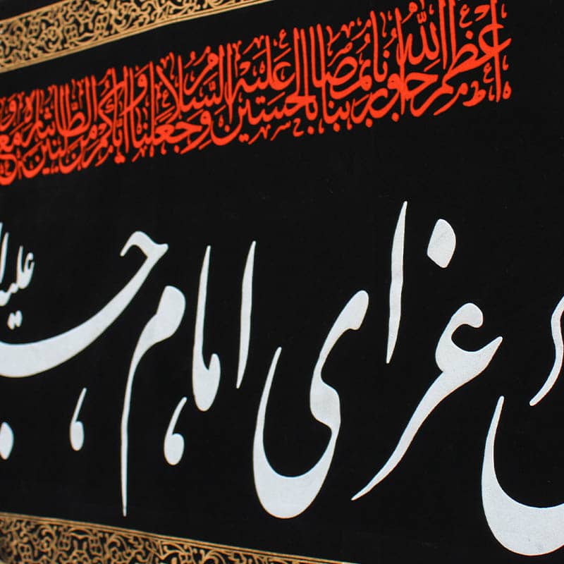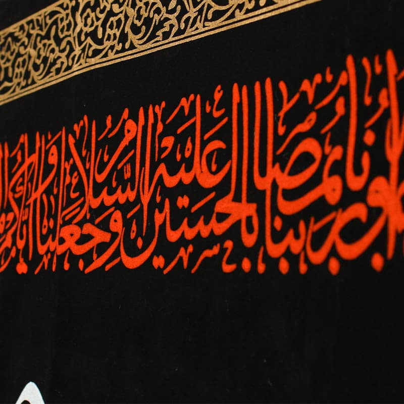 در حاشیه ابتدایی پرچم نمونه ای تسلیت گویی برای امام حسین (ع) به زبان عربی طراحی و چاپ شده.