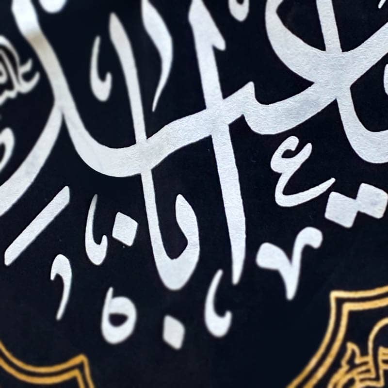 جنس پرچم از مرغوب ترین مخمل در بازار می باشد و طرح روی آن به صورت سیلک و طلاکوب چاپ شده است.