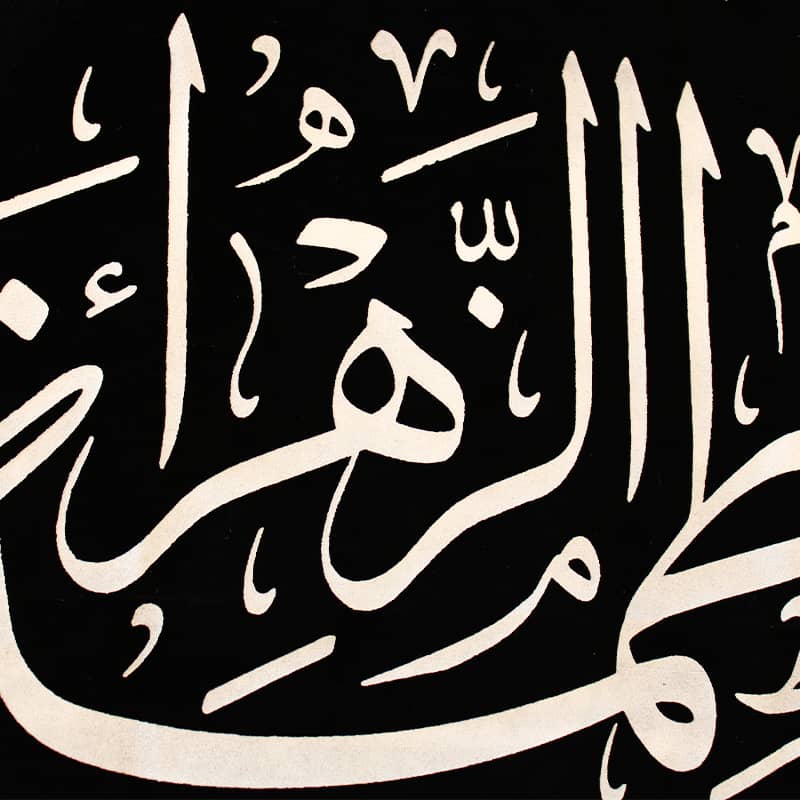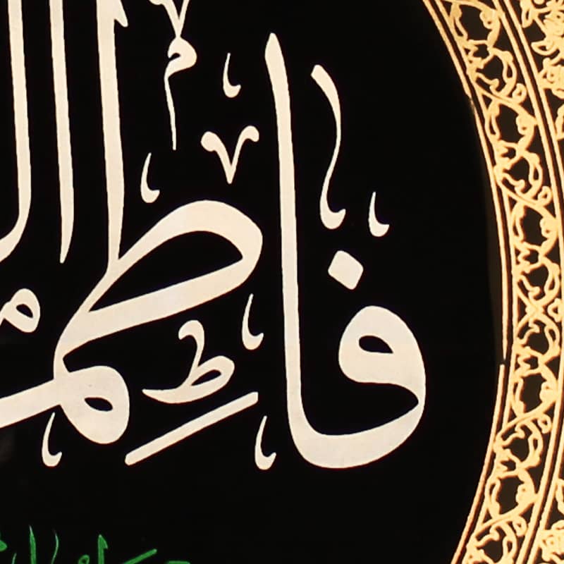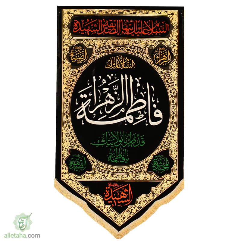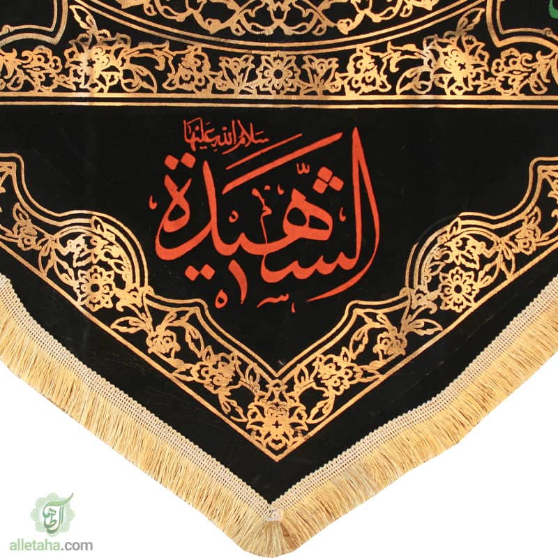در قسمت بالای این پرچم ، ذکر ” السلام علیک ایتها الصدیقه الشهیده” با رنگ نارنجی به چشم می خورد.